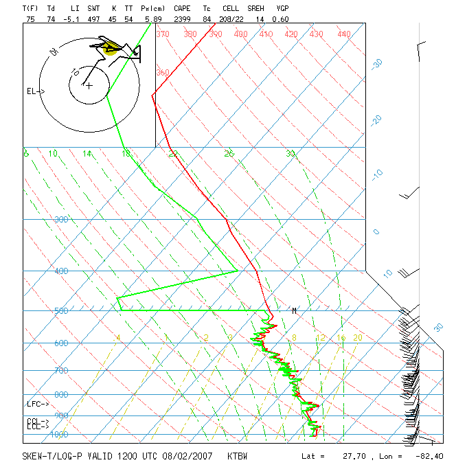 Fig. 6 - This sounding from Tampa Bay, FL, exhibits extreme high frequency noise below 500 mb. Interestingly, as in Fig. 4, once the high frequency noise ends, there are few data points recorded for the rest of the flight.